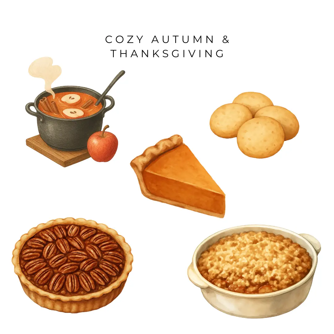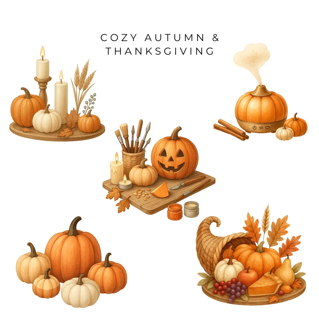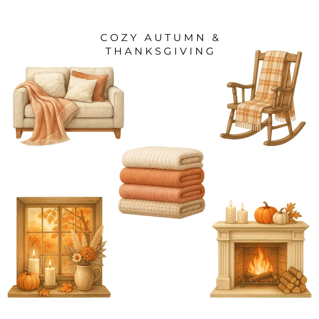 Cozy autumn and Thanksgiving elements (pumpkins, candles, pies, blankets, wreaths & home décor)