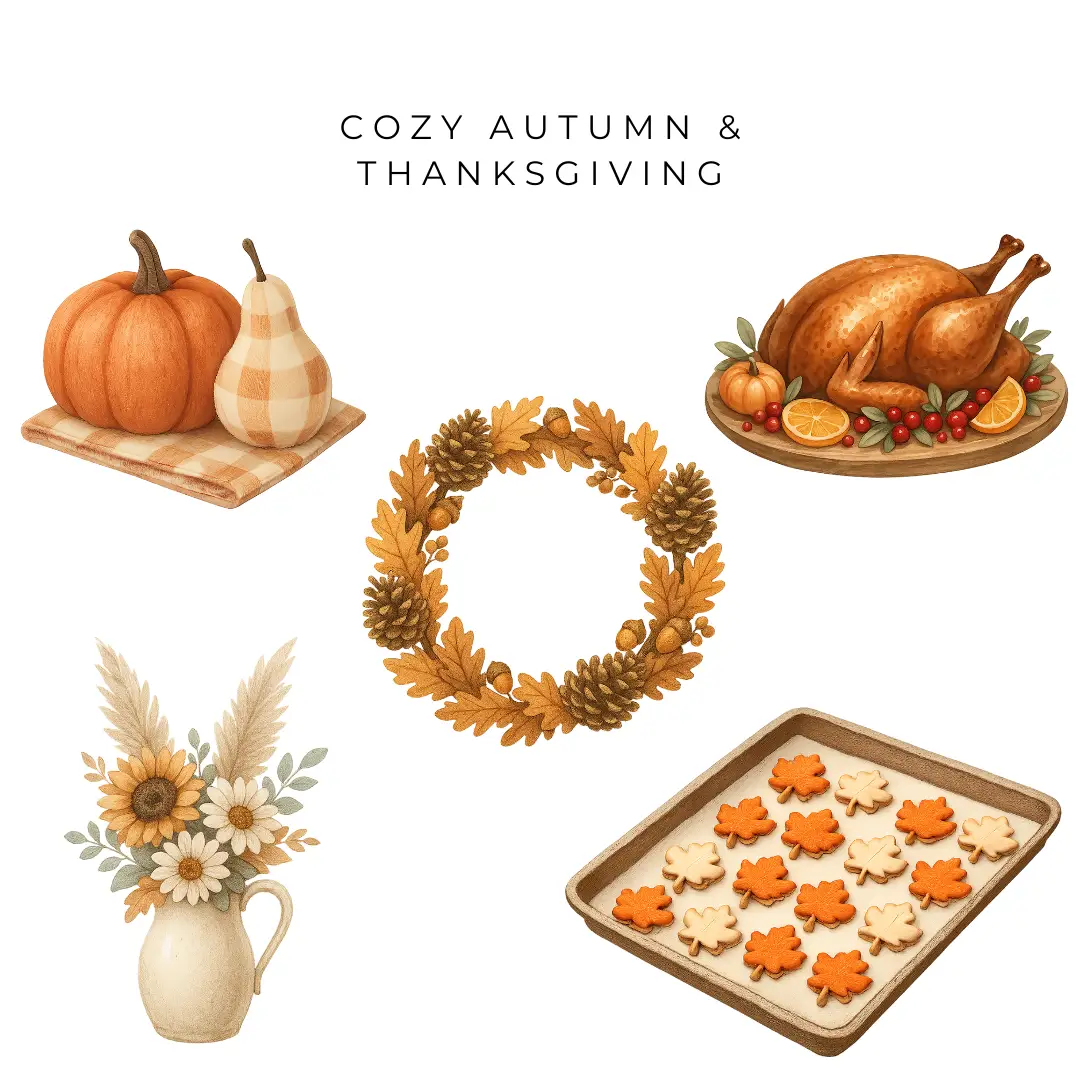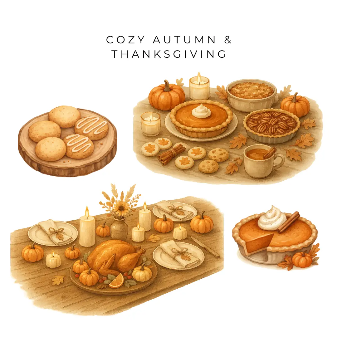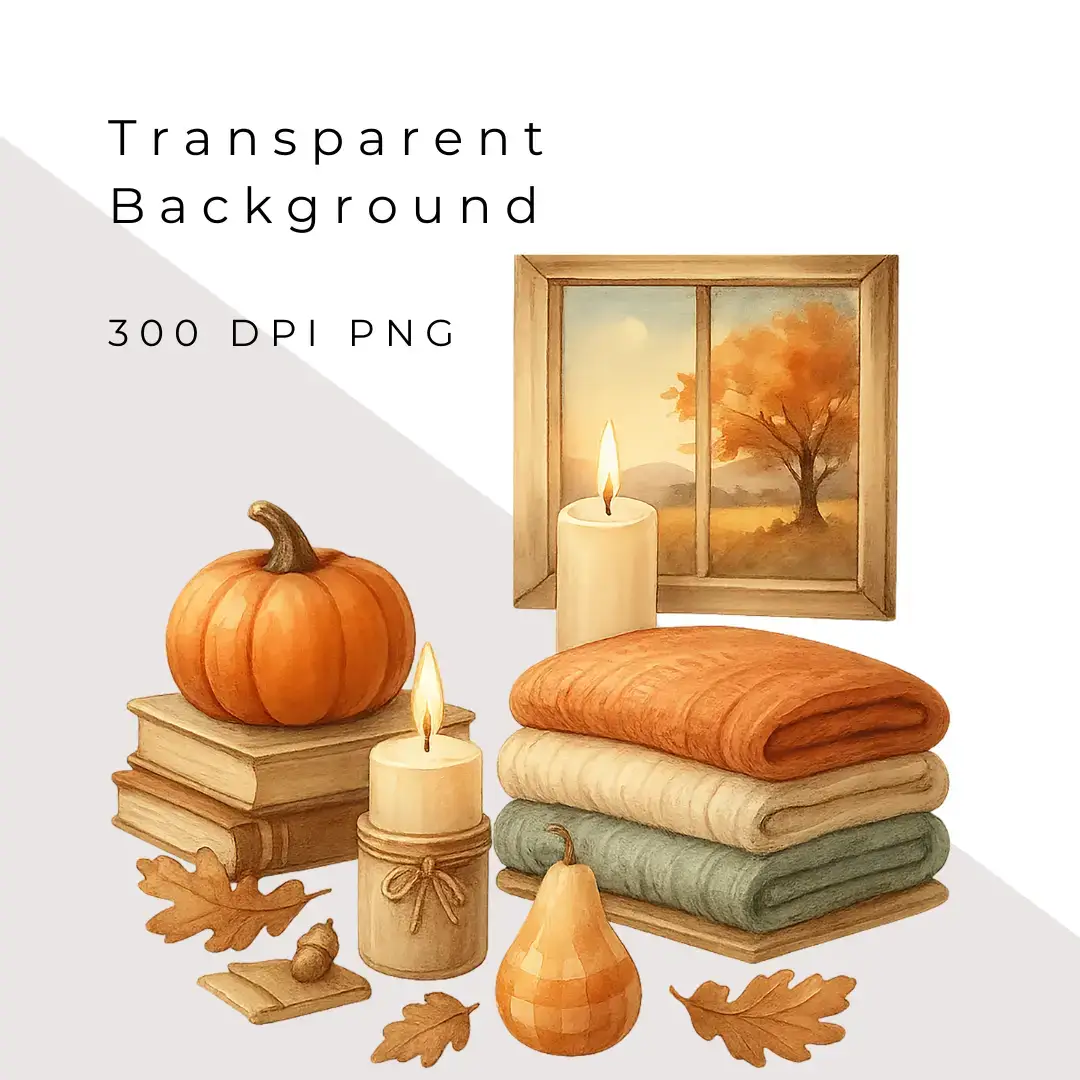 Perfect for digital product sellers, crafters, and designers, this beautiful collection includes 26 illustrated autumn and Thanksgiving-themed PNGs — featuring cozy home scenes, pumpkins, candles, baked pies, blankets, and festive table settings. Each element captures the inviting essence of fall with soft watercolor textures, neutral tones, and heart-warming details that bring a cozy seasonal feel to any project.