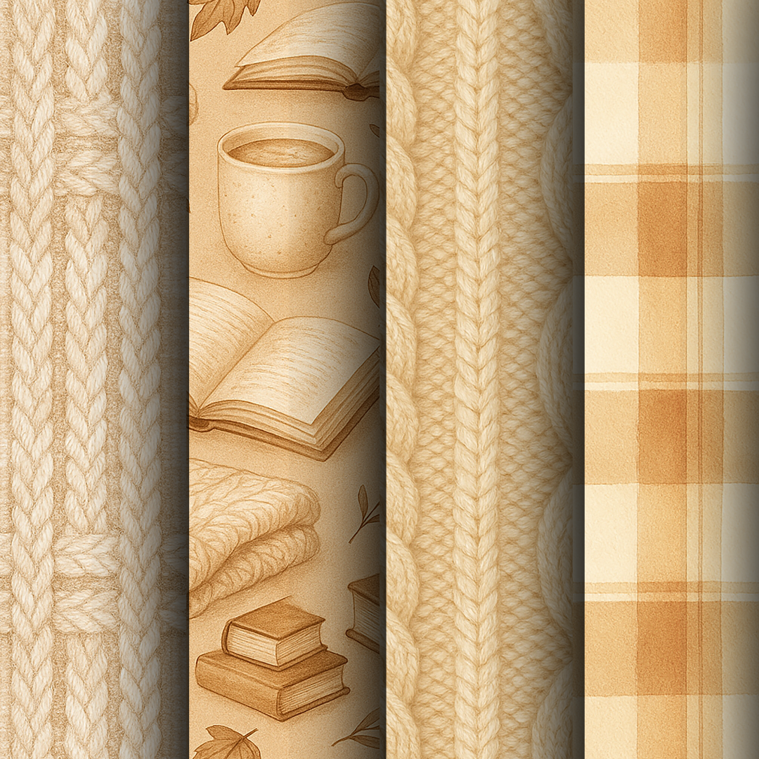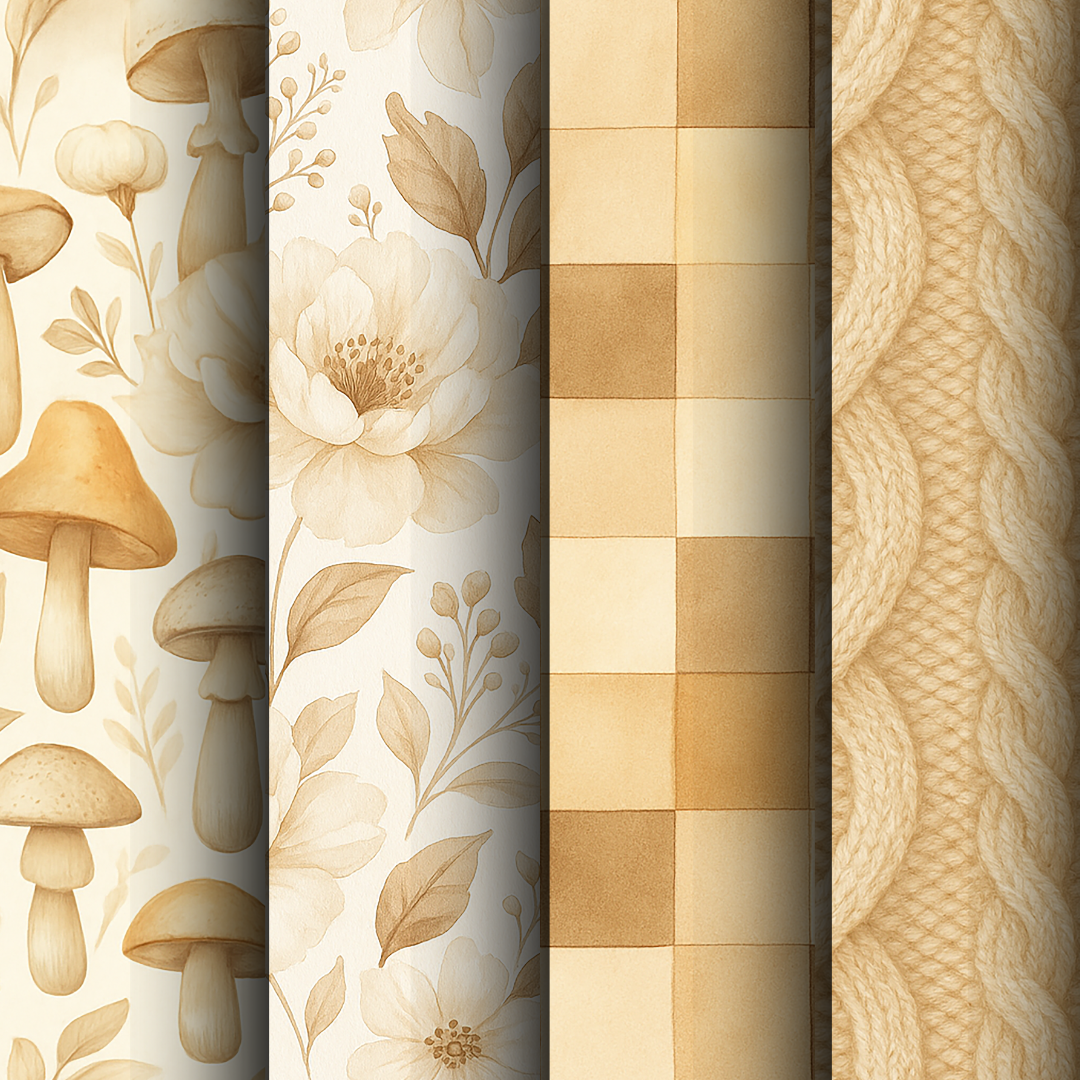 This collection includes 14, 12×12” watercolour papers (300 DPI) featuring pumpkins, autumn foliage, and cosy cottage-inspired patterns — perfect for seasonal product designs or year-round rustic projects. Each design captures the gentle warmth of fall with soft, neutral tones, textured details, and artistic depth that elevate any digital or printable product.